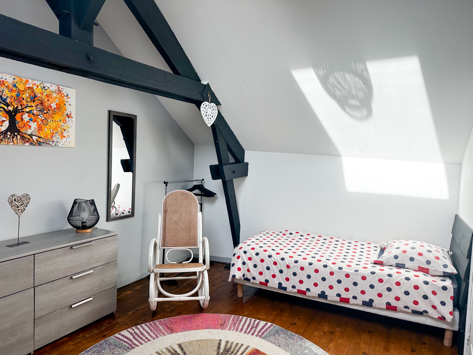 À l'étage, trois chambres spacieuses permettent d'héberger jusqu'à 7 personnes grâce à 3 lits doubles et 1 lit simple. Un espace bureau est également à disposition, ainsi que des toilettes séparées pour plus de confort.
